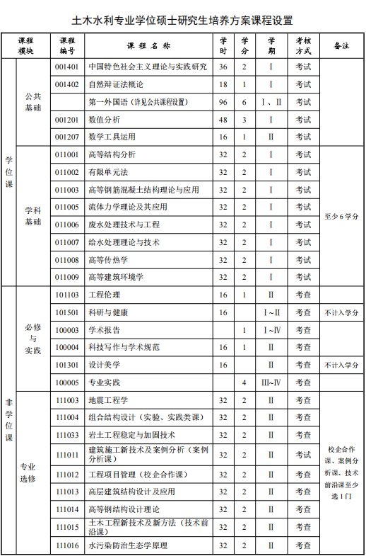 附:土木水利专业学位硕士研究生培养方案课程设置